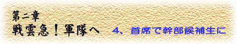 | 初年兵の教育は春3月に終わった。序列は首席であった。実技、学業を含めた総合点である。